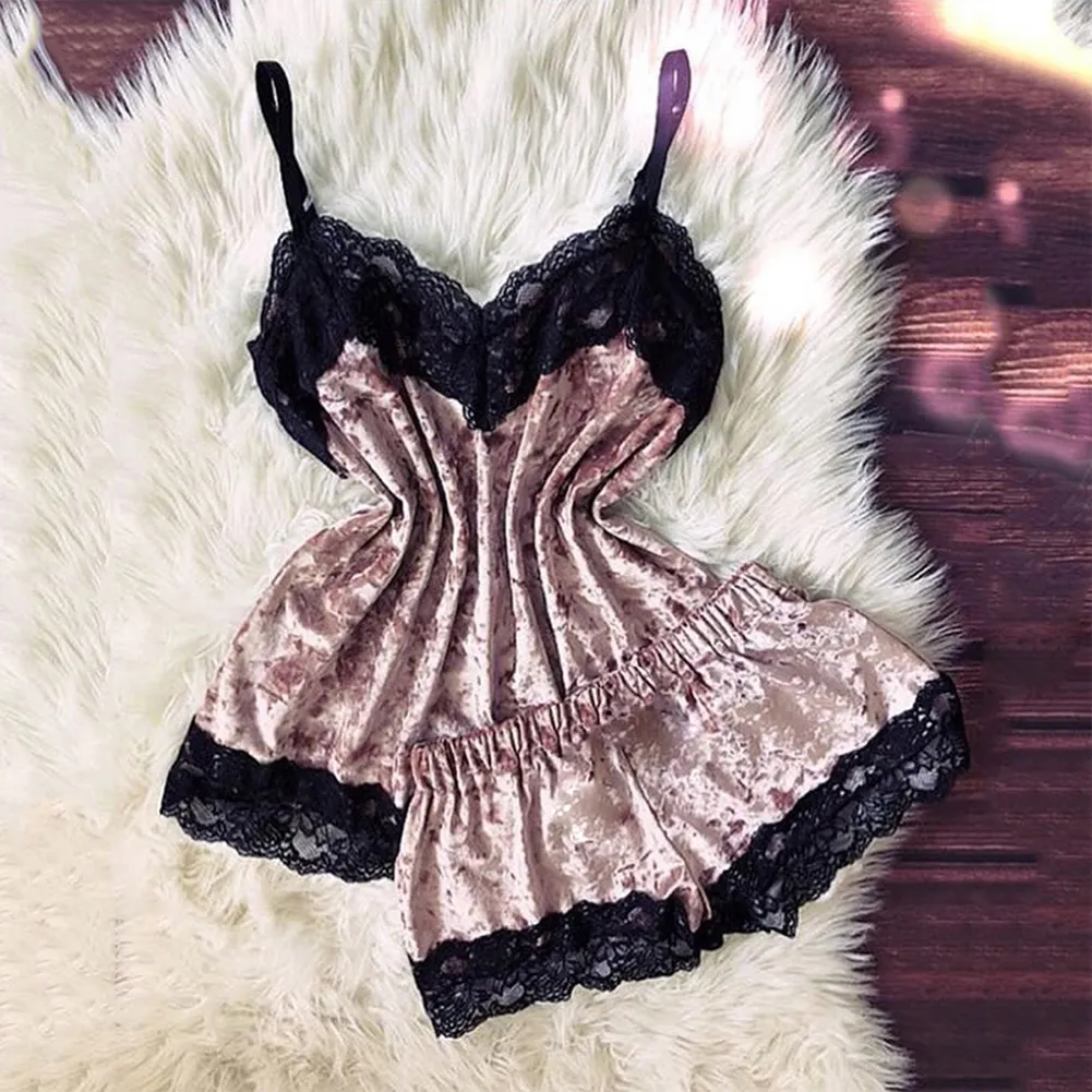 Wholesaleactivewears Pink Bow Strap V-neck Lace And Gold Velvet Pajamas For Women