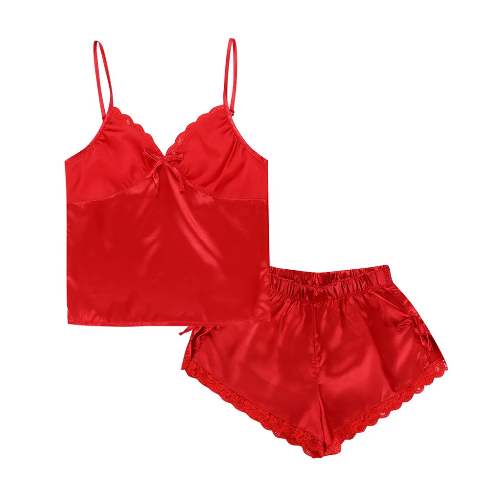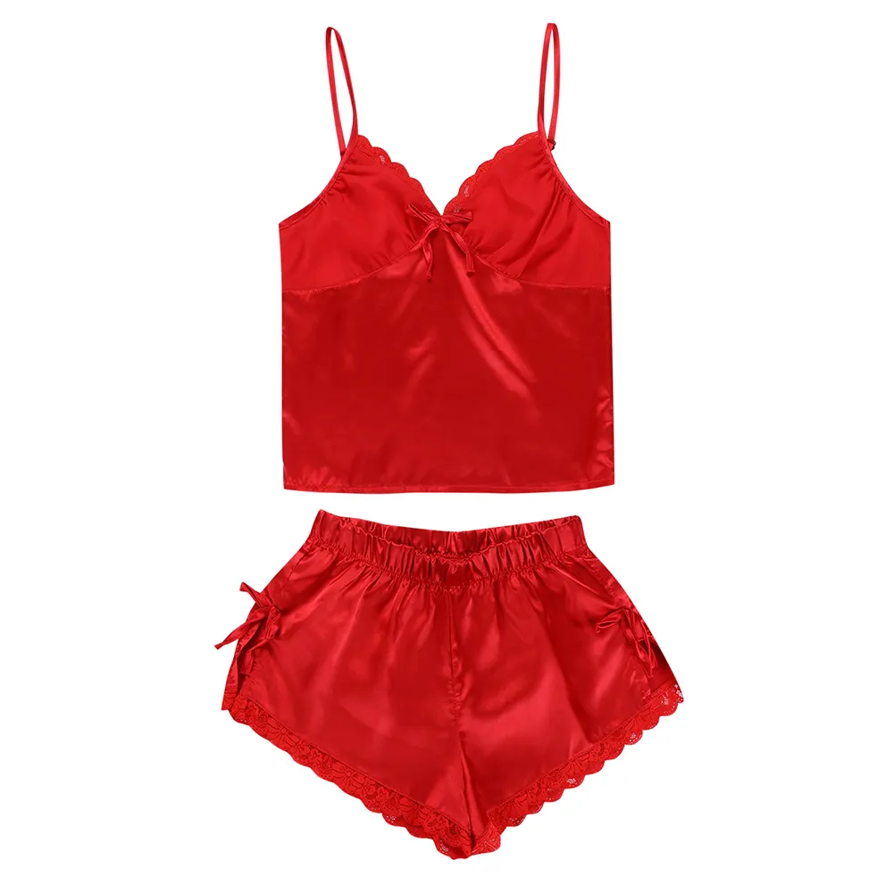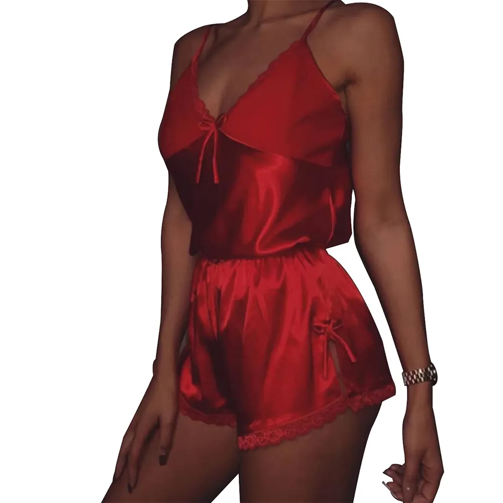Wholesaleactivewears Red Open Back V Collar Lace Sleepwear Set