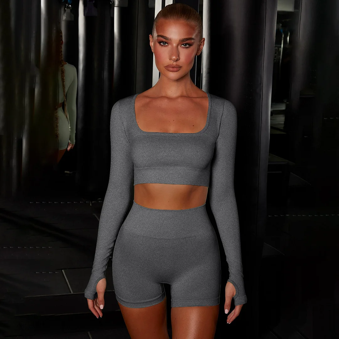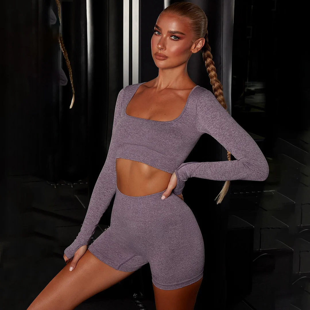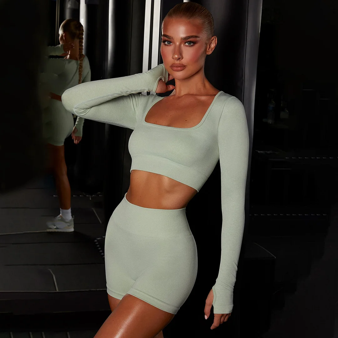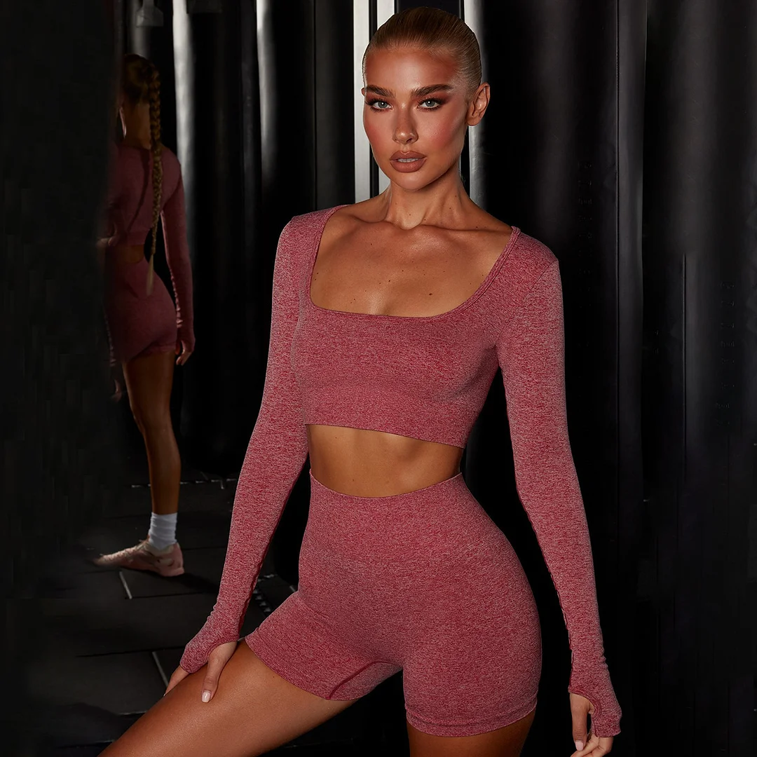 Wholesaleactivewears Orange Seamless Knit Flat Neck Long Sleeve Yoga Suit