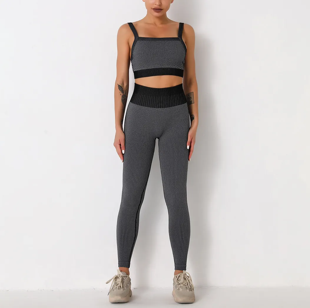 Wholesaleactivewears Coffee Seamless Sexy Striped Shockproof Beauty Back Bra Trousers Yoga Sports Suit