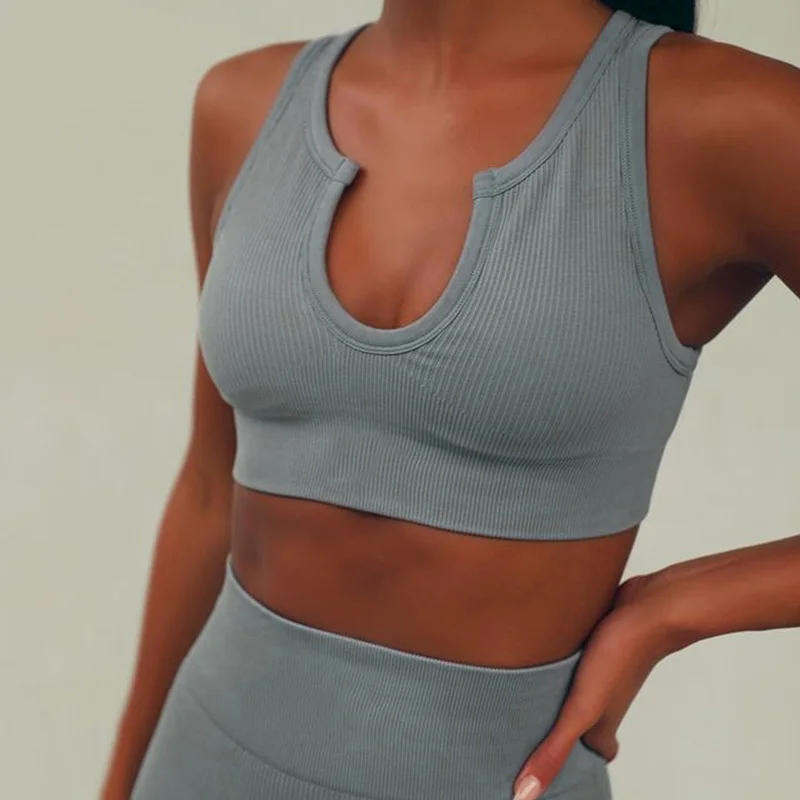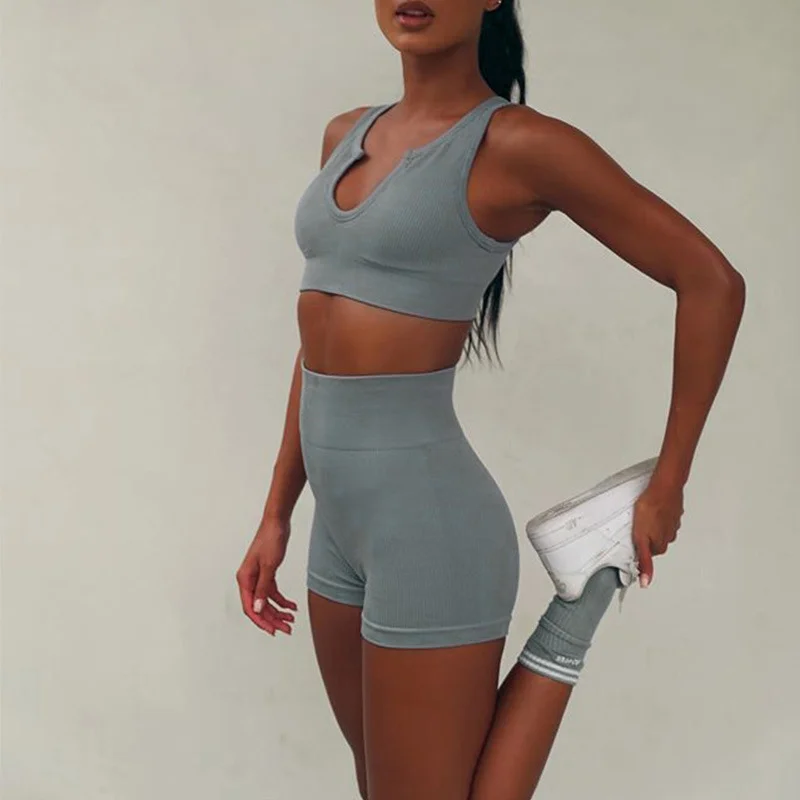 Wholesaleactivewears Brown U Neck Seamless Knitted Sexy Sports Short-sleeved Shorts Yoga Wear Fitness Suit