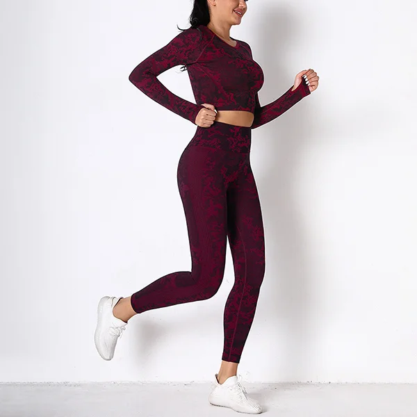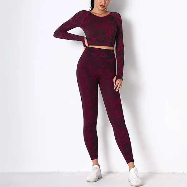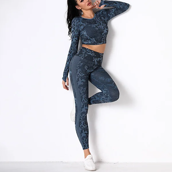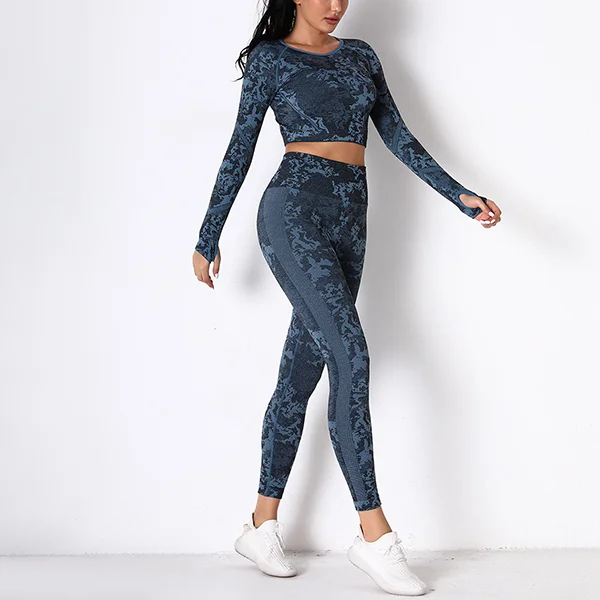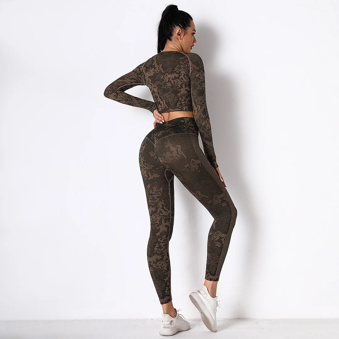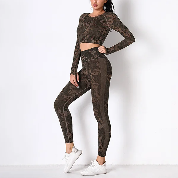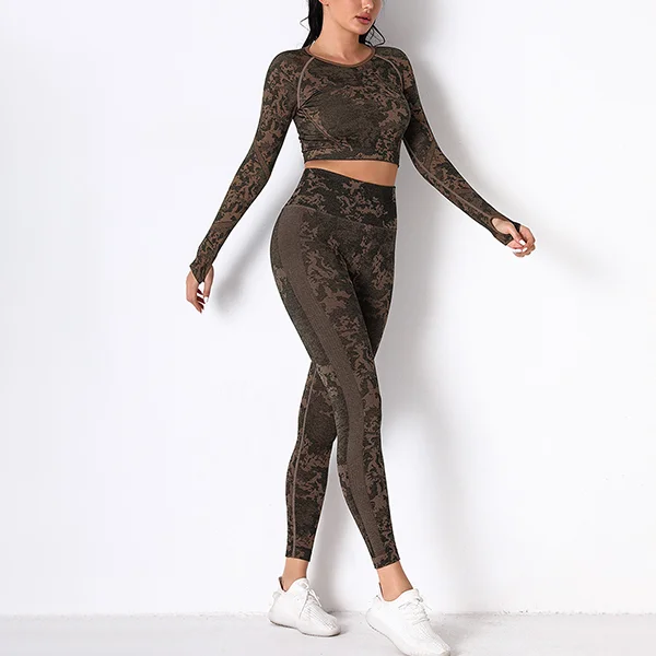 Wholesaleactivewears Gray Seamless Knitted Camouflage Corset Yoga High Elastic Body Long Sleeve Yoga Pants Suit